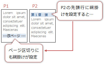 ★P2先頭の見出しに網掛けを設定すると、P1のページ区切りにも網掛けがついてしまう。