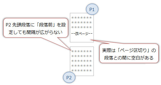 (つまりこれが「段落前」になる)との間に段落間隔が設定され、何も起こらないように見えるのです。(実際はページ区切り