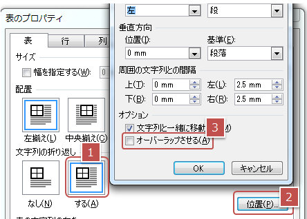 「表」タブで「文字列の折り返し」=「する」にし「位置」をクリック