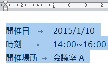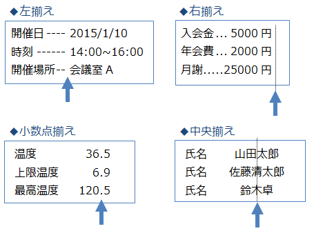 タブとは、文章の一部を好きな場所で揃えることができる機能です。↓のように各項目で揃えることができます。