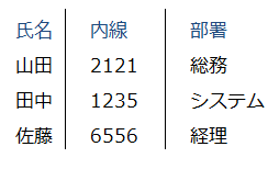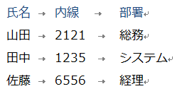 氏名・内線・部署が入力してありますが、項目(列)ごとに分かれていないので少々見づらい感じです。