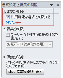 テーマの変更の禁止は「校閲」タブ−「編集の制限」−「設定」−「テーマまたはパターンの切り替えを許可しない」にチェックを入れるだけで可能です。(文書保護を開始したりパスワードを設定しなくてもできる)但しこの場合は簡単に解除できるので、パスワードを設定して文書保護をかけたい場合は、「利用可能な書式を制限する」にチェックを入れ、書式制限をする必要があります。 |