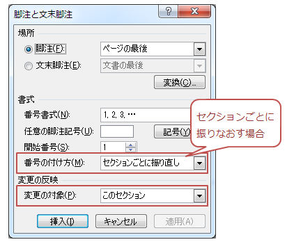 ページをセクション区切りで区切る→ 「ページレイアウト」タブ−「区切り▼」−「次のページから開始」(または「現在の位置から開始」) 脚注を変更したいセクションで「参考資料」タブ−「脚注と文末脚注」ボタンをクリック 「脚注と文末脚注ダイアログ」で次のような変更を行う セクションごとに番号書式や開始番号を変更したい … 番号書式や開始番号を変更し「変更の対象」=「このセクション」として「適用」をクリック 全セクションごとに番号を振りなおしたい … 「番号の付け方」=「セクションごとに振り直し」とし、「変更の対象」=「文書全体」★1とし「適用」をクリック ★1 特定のセクションのみ番号を振り直したい場合は「変更の対象」を「このセクション」にします。