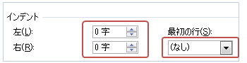 「書式▼」−「段落」をクリックし「インデントと行間隔」タブで左右インデントを0字(なし)にし「OK」をクリック