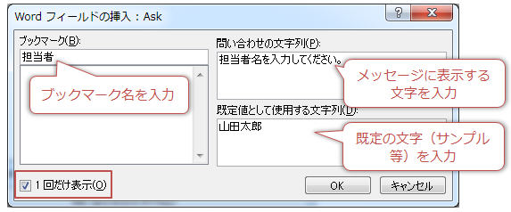 ASKフィールドはメイン文書にデータを差し込む時に入力を求めるメッセージを表示し、入力された値をブックマークに格納するフィールドです。そのブックマークをメイン文書に挿入しておけば一括して入力されたデータを差し込むことができます。(似た動作をするFILLINフィールドはこちら)