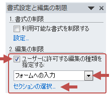 「ユーザーに許可する編集の種類を指定する」にチェックを入れ、「フォームへの入力」を選択し「セクションの選択」をクリック