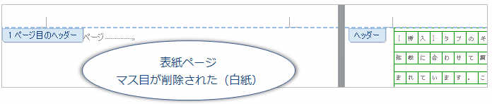 他のページをマス目なし(図を削除)にしたい場合はセクション区切りを挿入し、そのセクションのヘッダーフッターから図を削除します。(操作方法はこちら)