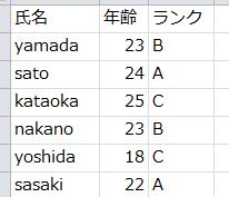 yamadaはランクBなので(True)スキップして次レコード検証 satoはランクAなので(False)スキップせずレコード挿入して終了。 kataokaはランクCなので(True)スキップして次レコード検証 nakanoはランクBなので(True)スキップして次レコード検証 yoshidaはランクCなので(True)スキップして次レコード検証 sasakiはランクAなので(False)レコード挿入して終了。