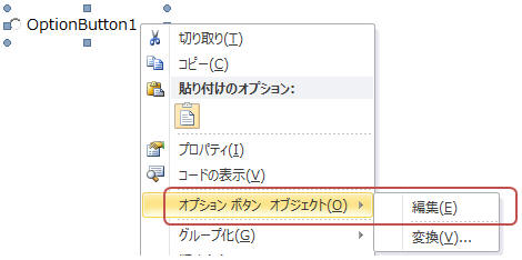 オプションボタンが挿入されたら右クリック−「オプションボタンオブジェクト」ー「編集」をクリック