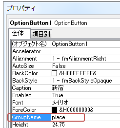全てのボタンのGroupNameを同じ文字列にする ★補足:プロパティダイアログは表示したまま、次々ボタンをクリックしてGroupNameを入力できます。