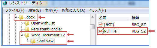 ◎解決法:レジストリHKEY_CLASSES_ROOT\.docx\Word.Document.12\ShellNew\NullFile(文字列値)を追加する 「スタート」−「プログラムとファイルの検索」ボックスでregeditと入力 → レジストリエディタ起動 ★注!HKEY_CLASSES_ROOT\.docx\Word.Document.12\ShellNewがある場合は2~5の操作は不要です。 HKEY_CLASSES_ROOT\.docxで右クリックし「新規」−「キー」をクリック キー名に「Word.Document.12」と入力 Word.Document.12キーで右クリックし「新規」−「キー」をクリック キー名に「ShellNew」と入力 ShellNewで右クリックし「新規」−「文字列値」をクリック 値を「NullFile」とする デスクトップ等エクスプローラ上でF5キーを押す(画面更新) 又は PCを再起動する →→ 右クリック−「新規作成」をクリックすると「Microsoft Word文書」が表示されます。