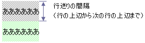 行送りとは、行の上辺から次の行の上辺までの間隔です。(正確には"文字+上下の余白で1行"なので、行の余白上から次の行の余白上までを行送りと言います)