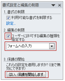 「校閲」タブ−「編集の制限」で「フォームへの入力」を選択し「はい、保護を開始します」をクリック