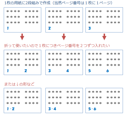 「横向きの用紙に2段組みで作成した」「表で作成した」といった場合に自由にページ番号を振りたいのでしょう。(本来は袋とじや1枚に2ページ印刷等を使います)