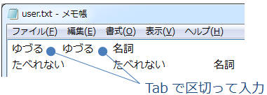 メモ帳を開き、登録したい単語の【単語】【よみ】【品詞】をTabキーで区切って入力(1単語につき1行ずつ)
