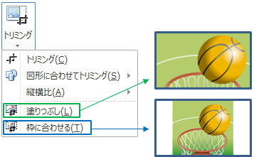 図を選択し「書式」タブ−「トリミング▼」−「塗りつぶし」をクリック → 図形と画像が独立して表示