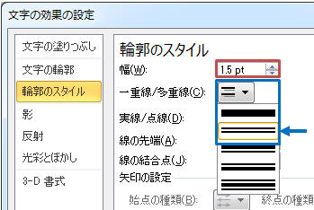 2. 再度「文字の効果」−「文字の輪郭」で「実線/点線」ー「その他の線」をクリック