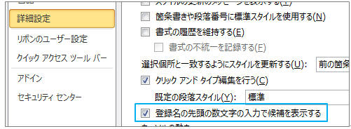 「ファイル」−「オプション」−「詳細設定」をクリック 「オートコレクト」ダイアログの「登録名の先頭の数文字の入力で候補を表示する」のチェックを入れ「OK」をクリック