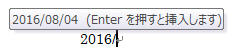 2016/ を入力して確定 → ポップヒントが表示 Enterキーを押す → 西暦で本日の日付が挿入される