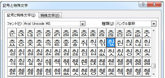 「フォント」を「Arial Unicode MS」などにし、種類を「ハングル音節」として挿入