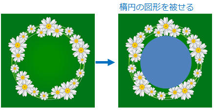 同じ色のピクセルを透過するので画像に図形を被せて図に変換後、透過すると自由な形で透過できます(「複数箇所を透過」を参照)周囲の線が残るので枠線なし、塗りつぶし色も薄い方が綺麗に透過されます。