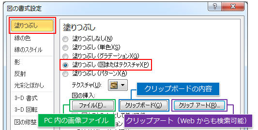 「塗りつぶし」を選択し「塗りつぶし(図またはテクスチャ)」をクリック