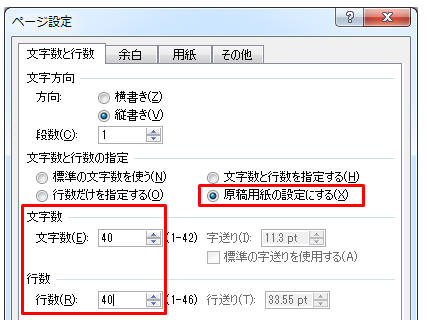 ページ設定ダイアログを開き「原稿用紙の設定にする」がONである状態で「文字数」と「行数」を指定し「OK」をクリック