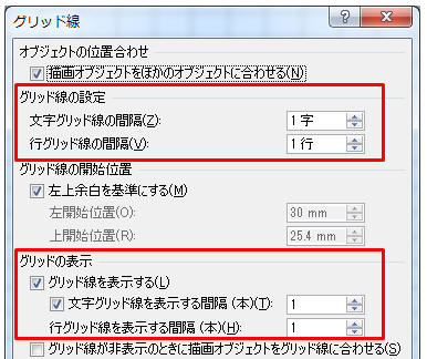 「グリッド線を表示する」にチェックを入れ「文字グリッド線を表示する間隔」=1、「行グリッド線を表示する間隔」=1として「OK」