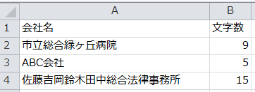 Excel(データファイル)側で、LEN関数を使い会社名の文字数を出しておいてください。この文字数を条件に使います。