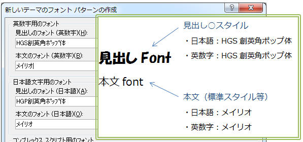 本文や見出しで使うフォントを指定します。ユーザーは「標準スタイル」「見出しスタイル」などを適用すると自動的にこれらのフォントが使われます。(テーマ側でフォントを指定しておくと、テーマを変更するだけで各見出しや本文のフォントを一括変更できます) ★【見出し用のフォント】と【本文用のフォント 】があり、それぞれ日本語用・英数字用のフォントを指定します。 ・見出し(日本語用:MSゴシック、英数字用:Arial) ※テーマOfficeの場合 ・本文(日本語用:MS明朝、英数字用:Century) ※テーマOfficeの場合 ページレイアウト「テーマ」−「フォント▼」をクリックし「新しいテーマのフォントパターンの作成」をクリック 「見出しのフォント」「本文のフォント」 で日本語用・英数字用それぞれ指定し、名前を付けて「保存」をクリック ★テーマで指定できるのはフォントのみで、フォントサイズ等は格納しません。(サイズ等はスタイルに格納)