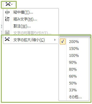 例 …… 文字を選択し「ホーム」タブ−「拡張書式」ボタンから「文字の拡大/縮小」で倍率を選択します。 ★フォントダイアログー「詳細設定」−「倍率」で指定しても同じです。