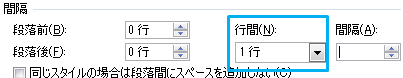 「インデントと改行」タブにある「行間」を「1行」にする