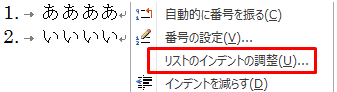 段落番号で右クリックし「リストのインデントの調整」をクリック