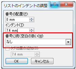 「番号に続く空白の扱い」を「なし」にし「OK」をクリック