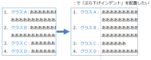 本来「ぶら下げインデント」は同一段落で2行目以降を揃える機能です。しかし今回は各段落の【1行目の:から】と【2行目以降のぶら下げ】を同じ位置で揃える必要があります。ドラッグでうまく揃えれば見た目では気づかれ