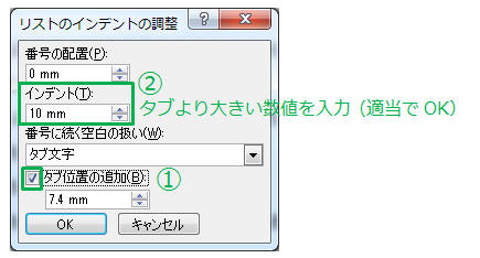 ませんが、完璧にしたいなら揃える箇所の前にタブを挿入します。このタブはタブマーカーがないのでぶら下げインデントで揃う(段落番号の機能と同じ)ため、ぴったりと合わせることが可能です。