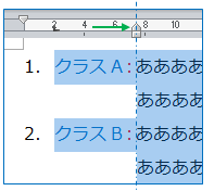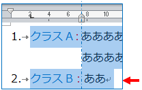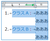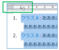 ▼ 範囲選択し、ぶら下げインデントをドラッグすると1行目のタブと2行目以降のぶら下げを同時に動きます。★段落番号はこの機能を使用