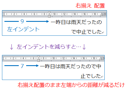 ▼ 多くの右揃え配置では左インデントは0なので、減らすものはなく何も変わりません。