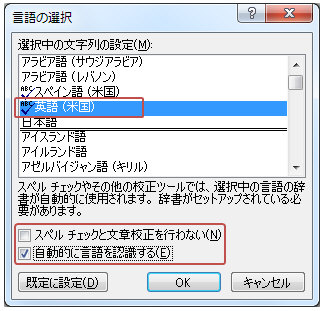 正しい言語(英語など)を選択し「スペルチェックと文章校正を行わない」のチェックをしっかり