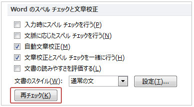 「Wordのスペルチェックと文章校正」で「文章校正とスペルチェックを一緒に行う」にチェックを入れる