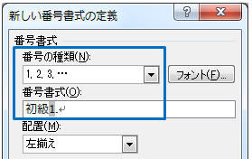 ホームタブ−「段落番号」ボタンをクリックし「新しい番号書式の定義」をクリック 「番号の種類」を選択し「番号書式」ボックスに文字列を入力(例:初級) 「OK」をクリック ★ 作成された段落番号は「段落番号▼」ボタンの「番号ライブラリ」に格納され、全文書で利用できます。 ★格納先はC:\Users\プロファイル\AppData\Roaming\Microsoft\Word\ListaGal.dat