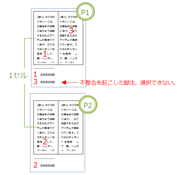 表に脚注を挿入した場合、1列目から順に挿入されます。次ページに連続しているセルの場合、次ページの脚注は前ページの2列目よりも先の番号になるため、脚注の順番が逆になってしまいます。