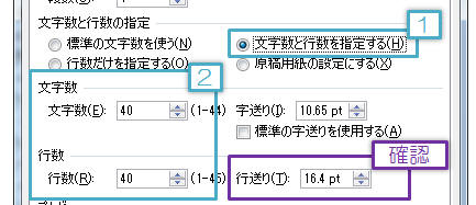 「ページ設定」ダイアログ→「文字数と行数」タブ→「文字数と行数を指定する」をONにし、文字数と行数を指定し「行送り」の数値を確認しておく