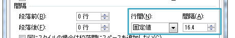 「行間」を「固定値」として2で確認した行送りの数値を入力する