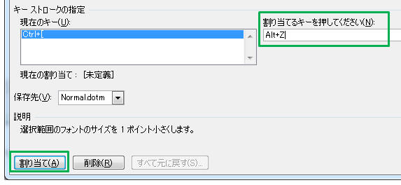 「割り当てるキーを押してください」で自由にキーを入力(Altキーと組み合わせ)し「割り当て」→「閉じる」→「OK」をクリック