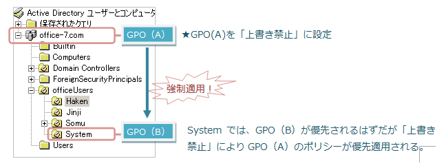 通常なら上位GPOは下位GPOより弱いのですが、「上書き禁止」により上位階層にあるGPOは最強とすることができます。