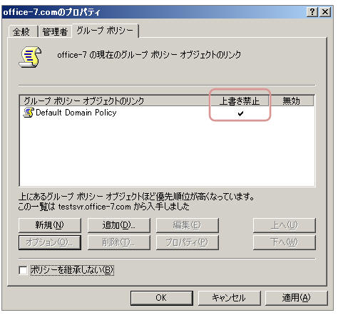 しかし上位GPOを「上書き禁止」することにより、下位GPOに上書きされないように設定できます。たとえ下位のコンテナで「ポリシーを継承しない」としていても強制的に適用させることができます。
