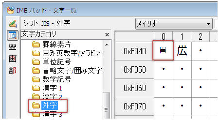 IMEパッド(文字一覧)から目的の外字をクリックして挿入します。(文字カテゴリはシフトJIS-「外字」)