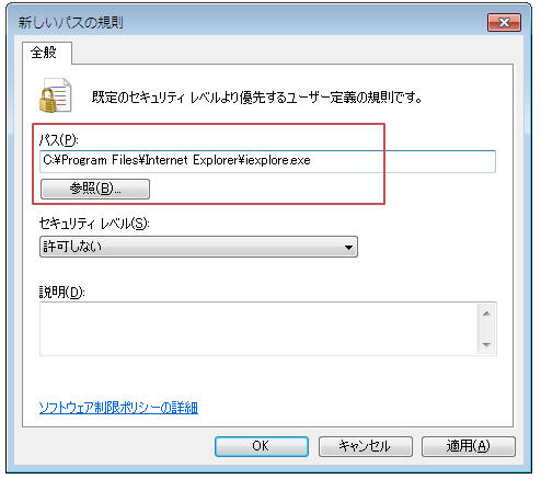 「適用」−「OK」をクリック(※初めてソフトウェアの制限ポリシーを作成した時は再起動が必要です。)