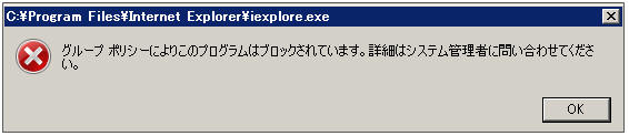 「スタート」−「プログラムとファイルの検索」ボックスに「gpedit.msc」と入力しEnterキーを押す→ ローカルグループポリシーエディタが起動します。 「コンピュータの構成」−「Windowsの設定」−「セキュリティの設定」−「 ソフトウェアの制限ポリシー」をクリック 「ソフトウェアの制限ポリシー」を右クリックし「新しいソフトウェアの制限ポリシー」をクリック 作成された「追加の規則」を右クリックし「新しいパスの規則」をクリック 「参照」をクリックし、アプリケーションを指定する(パスが表示されます) 「適用」−「OK」をクリック(※初めてソフトウェアの制限ポリシーを作成した時は再起動が必要です。) → 以後、指定したアプリケーションを起動しようとすると下記のダイアログが表示されます。 ※ 複数のアプリケーションの起動を禁止したい場合は、4の「新しいパスの規則」から追加してください。 ※ Active Directory環境であればドメイングループポリシーで一括して組織内のコンピュータに適用できます。 ※ セーフモードでは「ソフトウェアの制限ポリシー」は適用されません。